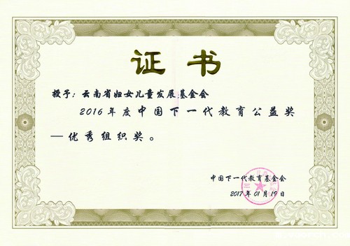 2015年12月,获得中国下一代教育基金会授予“优秀组织奖”;
